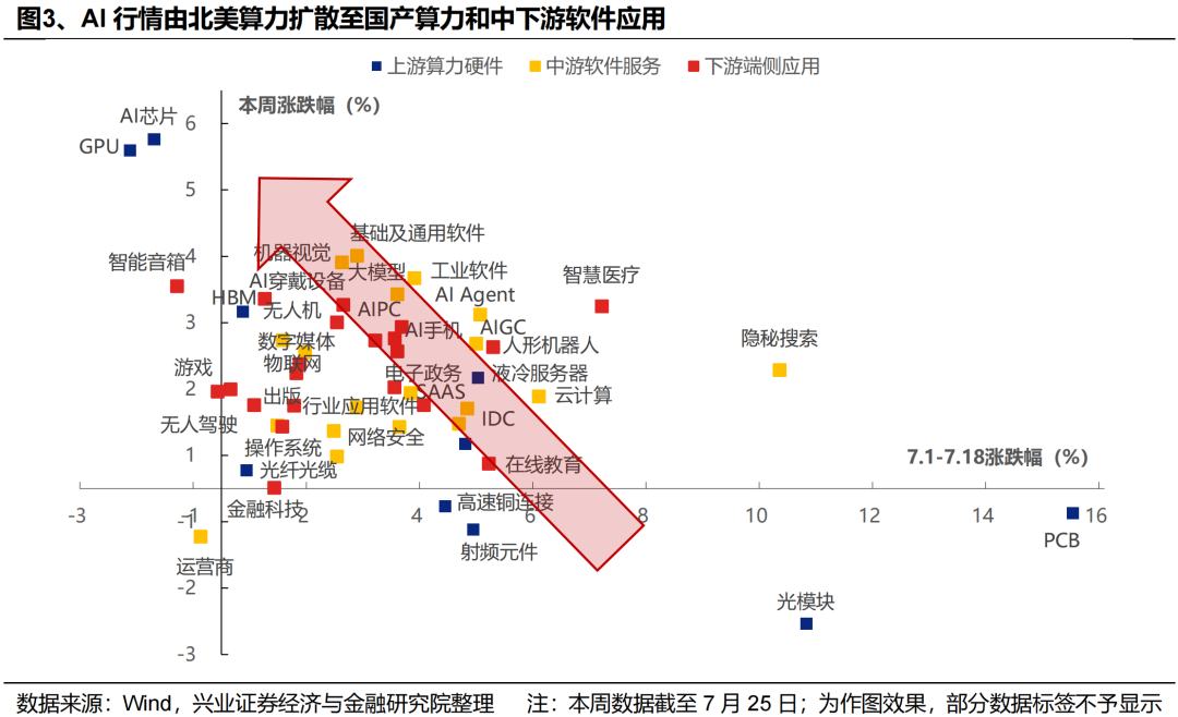 国产算力方面,国内互联网厂商资本开支增长仍是长期趋势,随着近期H20芯片限制再度放开,叠加三季度英伟达对华新卡B30有望完成市场导入,前期市场对互联网厂商的资本开支担忧有望持续减弱,叠加下半年燧原科技、壁仞科技等国产芯片企业有望上市的催化,国产替代逻辑下产业链确定性仍强。