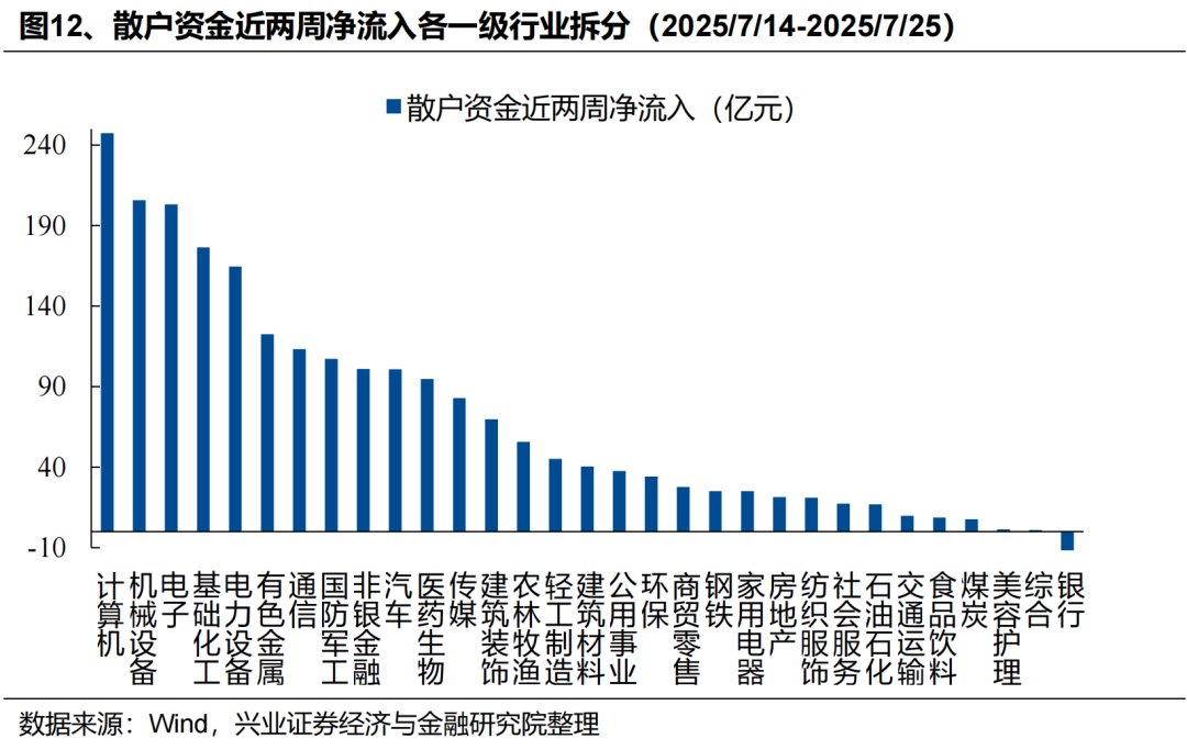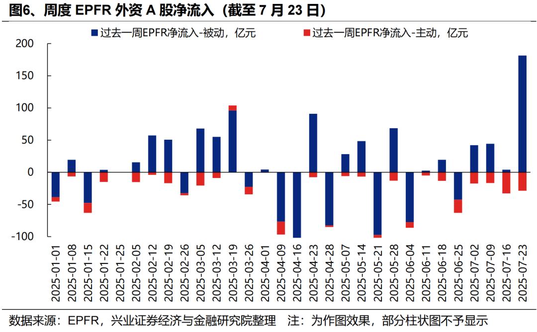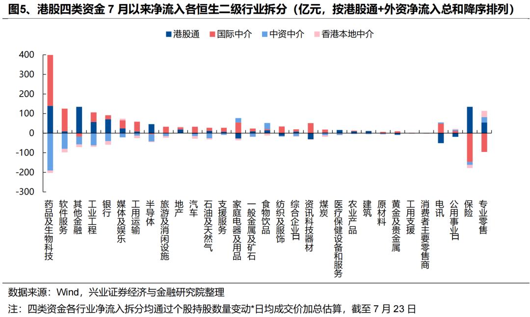 外资:近期外资流入港股意愿持续升温,积极配置医药、互联网、周期等板块,同时被动外资已在大幅回补A股仓位。一方面,7月以来外资流入港股意愿持续提升,据我们测算,7月以来(截至7月23日)国际中介净流入港股超644亿元,同期港股通净流入649亿元,外资流入规模已与南下资金相当。结构上,外资主要流入医药、软件服务、媒体娱乐、资讯科技器材、电讯等科技板块,同时“反内卷”政策驱动下,外资对工业工程(主要是宁德时代)、汽车、金属、煤炭等行业的关注度也在升温。另一方面,7月以来被动外资逐渐回补A股仓位,7/17-7/23更是净流入超180亿元,创去年10/11以来周度新高。