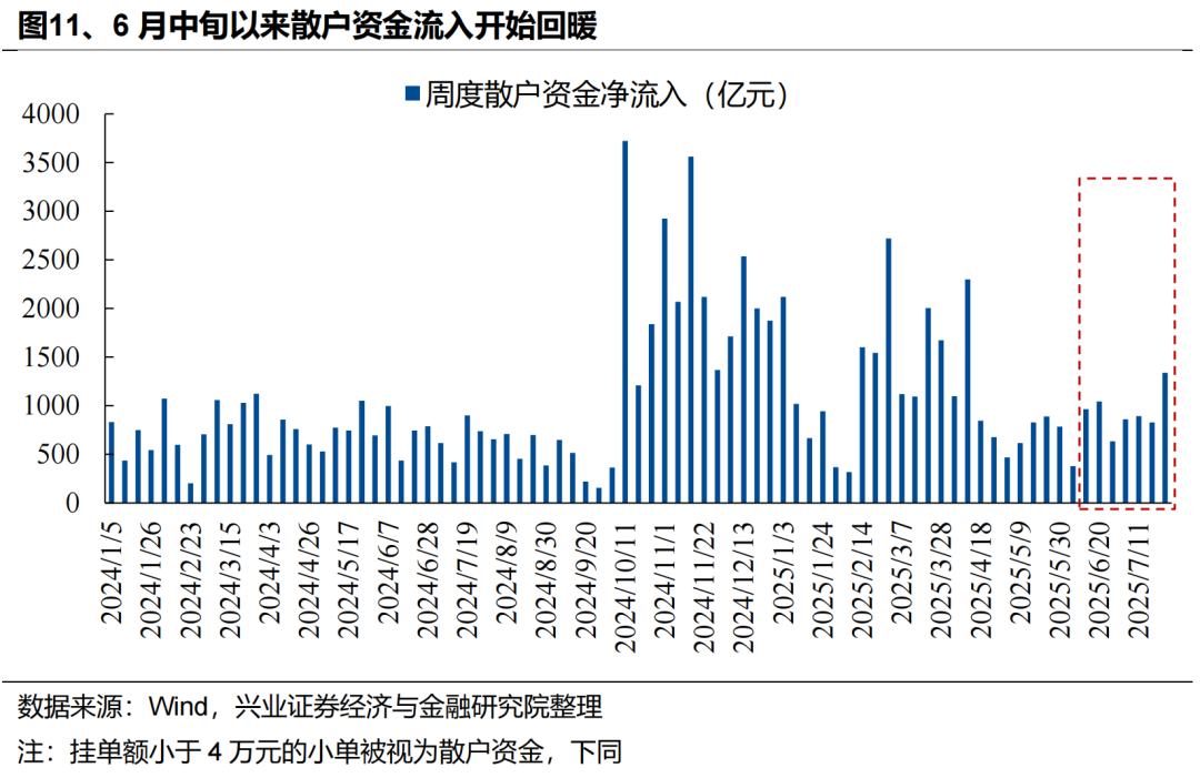 散户:6月中旬以来散户资金流入开始回暖,本周入市意愿进一步提升,同样青睐科技成长+周期。6月中旬以来,以小单表征的散户资金周均净流入937亿元,远高于4月下旬至6月上旬的周度均值662亿元,本周进一步提升至1337亿元,表明风险偏好抬升、赚钱效应吸引下,散户资金入市意愿进一步回暖。结构上,科技成长+周期同样是散户资金的显著共识,近两周主要流入TMT、机械、新能源、军工等成长行业,以及化工、有色、建筑建材等周期行业。