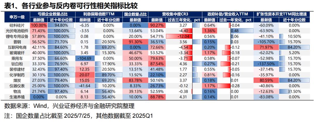 因此,随着政策主线地位提升、叠加当前市场已进行了一轮主线内部的扩散,各个细分方向已经有了较为充分的定价,当前对于“反内卷”主线的配置或将转向长期逻辑。我们从参与反内卷的迫切性(亏损企业数量占比&利息保障倍数)、反内卷执行的持续性(集中度变化趋势&国有企业数量占比),以及产能去化的阻力(政府补助力度变化趋势&扩张性资本开支强度)等三个维度分析哪些行业具备更好的反内卷基础(详见反内卷:三个维度行业机会比较)。