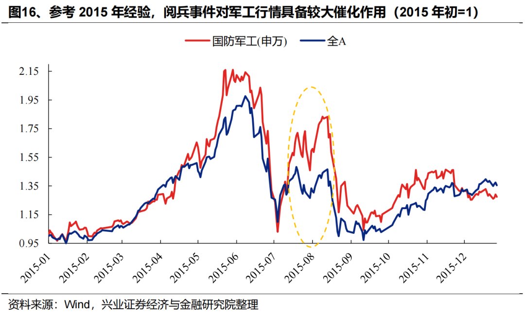 另一方面,参考历史经验,阅兵等事件将对军工行情构成重要催化。阅兵作为展示国家军事实力的重要时刻,是推动军工板块上涨的重要催化剂。回顾2015年9月3日的世界反法西斯战争胜利70周年大阅兵,7月9日起军工板块行情就开始反映阅兵事件的预期,至8月17日区间收益为78%,相对全A超额收益45%。未来一段时间,军工板块或处于事件催化的上涨预期之中。