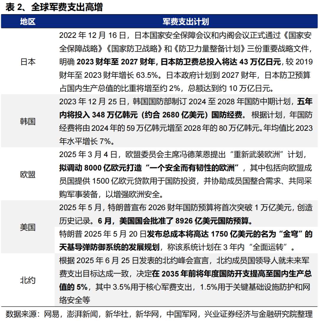 对外,当前世界面临百年未有之大变局,全球军备竞赛拉开帷幕。随着我国武器在世界持续展现强大竞争力,中国在国际军贸中的市场空间有望进一步打开。2月以来,特朗普政府关税战升级,印巴、中东等全球地缘政治紧张局势加剧,各国政府均在提高对国家安全的重视程度,全球军备竞赛序幕正在拉开。随着去年末我国六代机亮相、3月我国军舰绕澳大利亚环行展示,到二季度的台海联合演练、歼10CE在印巴冲突中大放光彩,中国武器持续展现全球竞争力。地缘冲突背景下国家安全牵引长期军贸需求,中国在国际军贸中的市场空间有望进一步打开。