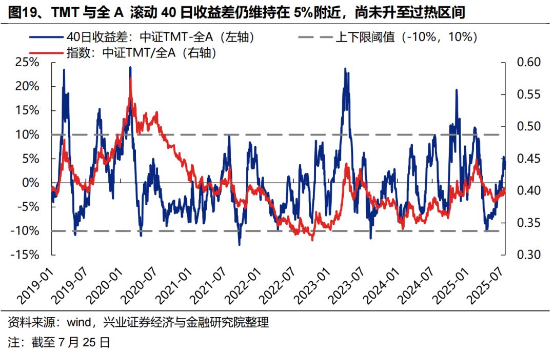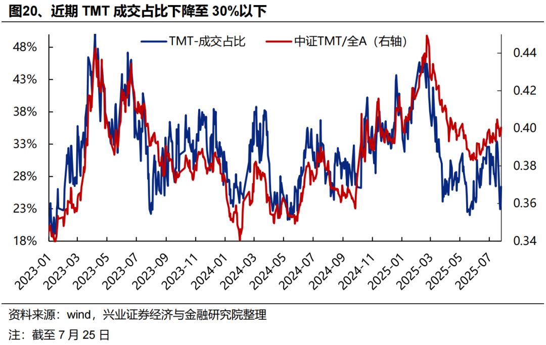 成交占比看,近期周期板块表现更强,当前TMT成交占比已下降至30%以下,距离历史上40%-45%的过热区间仍有距离,尚未发出过热信号。