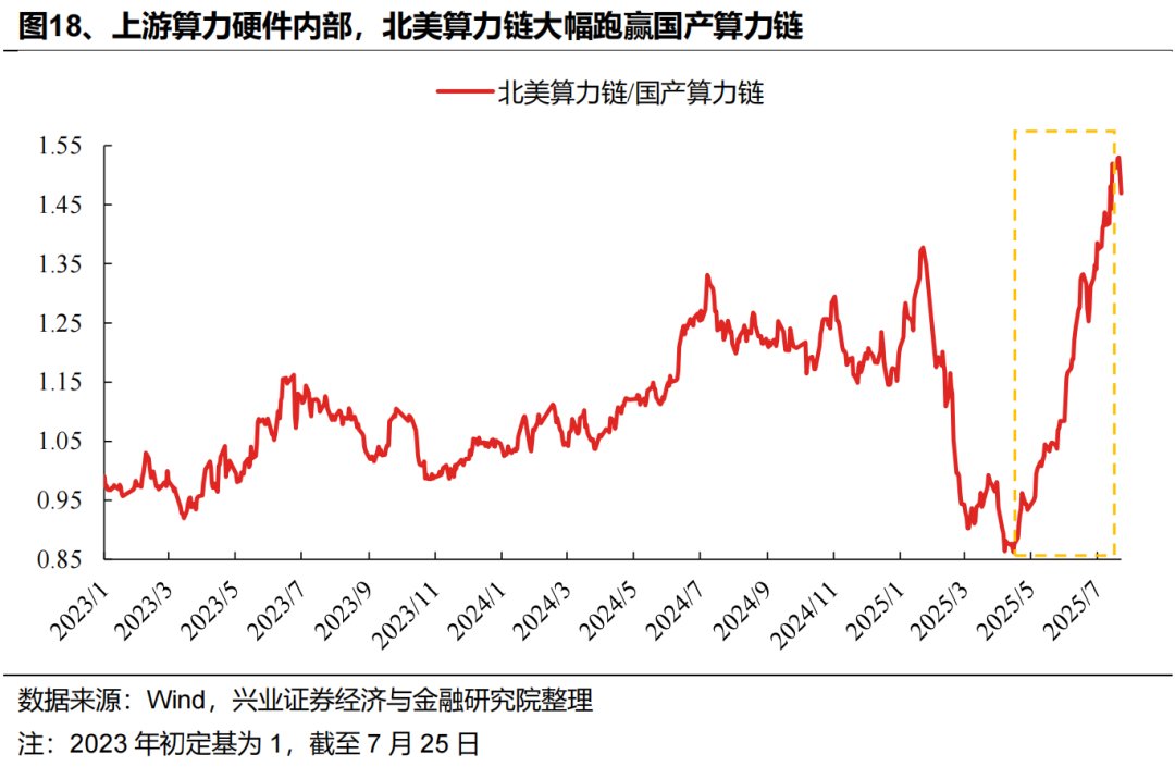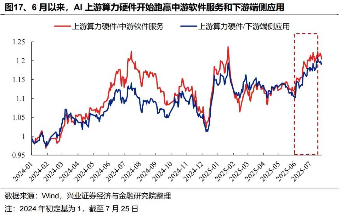 但我们观察到,尽管6月以来AI板块整体修复,但内部却出现两个明显的分化。一方面,以PCB、光模块为代表的上游算力硬件开始跑赢中游软件服务&下游端侧应用;另一方面,上游算力硬件内部,以光模块、PCB为代表的北美算力链大幅跑赢国产算力链。