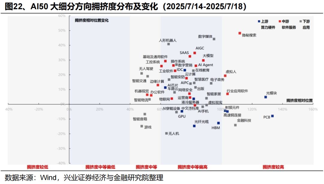 从AI50大细分方向的拥挤度上看,当前多数领域拥挤度仍处于偏中等水平,包括上游算力(AI芯片、IDC、GPU、液冷服务器)、中游软件服务(办公软件、基础及通用软件、操作系统、工业软件、SASS、AIAgent等)、下游应用(无人驾驶、游戏、人形机器人、智慧医疗等)。