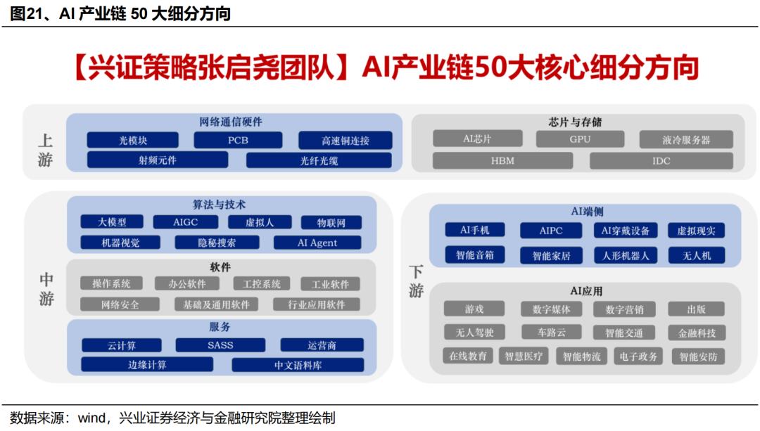 应用方面,DeepSeek助力AI平权后,更多垂直应用有望加速落地,行情从上游扩散至中下游是大趋势。近期Kimi K2、阿里通义Qwen3等新模型的发布表明国内大模型仍在快速迭代,而H20芯片放开、大厂重新加大对AI的投入后,国内AI应用的进展也有望进一步提速。此外,三季度中下游具备多重潜在催化,包括GPT-5、DeepSeek R2等大模型的进展,Meta在9月即将发布的AR眼镜等,都有望为AI应用和端侧带来新的催化。