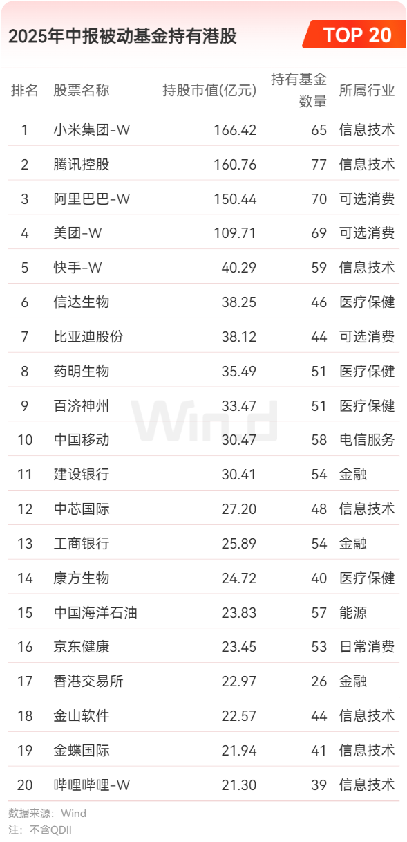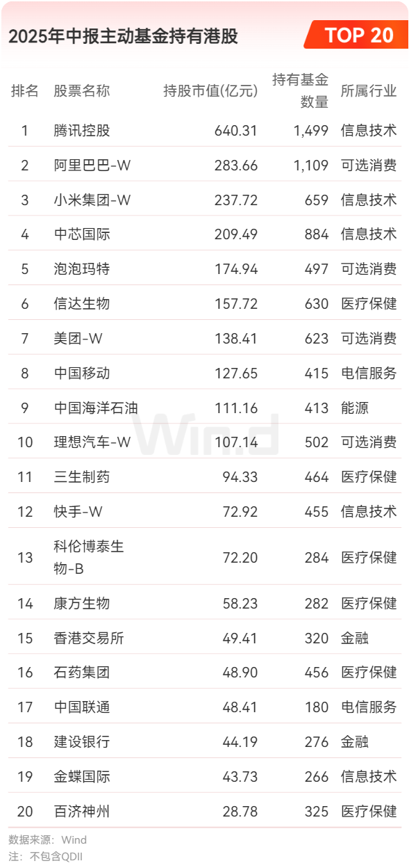 2025年中报,港股依旧是公募基金重要配置方向,主动基金的前四大重仓港股市值均超过200亿元。