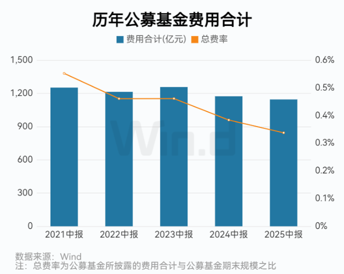 在公募基金推行降费政策后,2025年上半年公募基金各项费用合计较2024年同期下降28.45亿元至1149.35亿元;按合计费用占基金在管规模比计算的2025年基金上半年总费率为0.34%,相比去年同期费率明显回落。