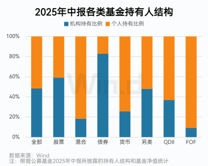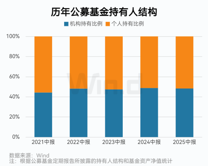 近一年公募基金持有人结构趋于平稳。截至2025年中报,机构持有公募基金占比达48.25%。