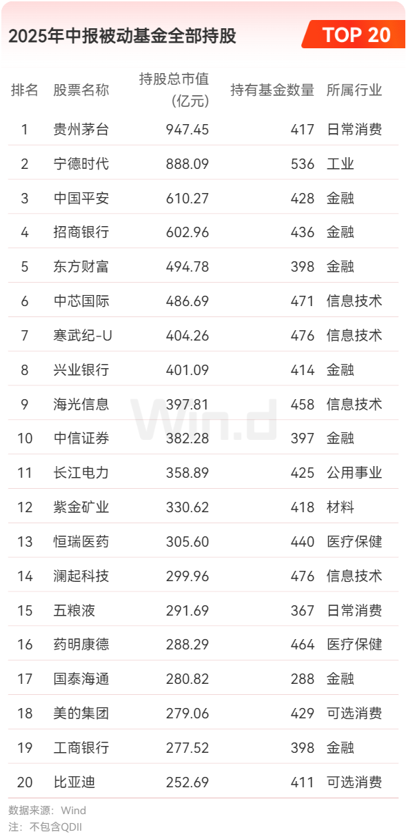 被动基金全部持股中前三大重仓股分别为贵州茅台(600519.SH)、宁德时代(300750.SZ)和中国平安(601318.SH)。