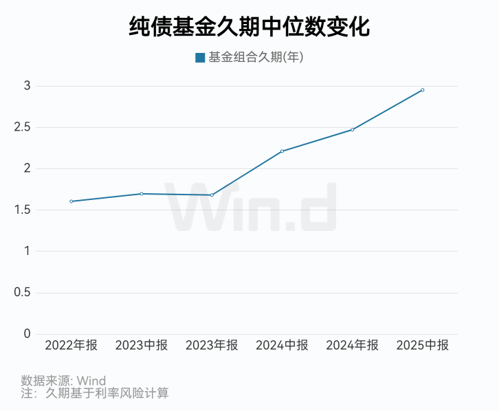 在债牛背景下,各债基管理人积极把握资本利得收益。2025年中报,纯债基金久期中位数提升至2.95,较去年年底增加0.48年。