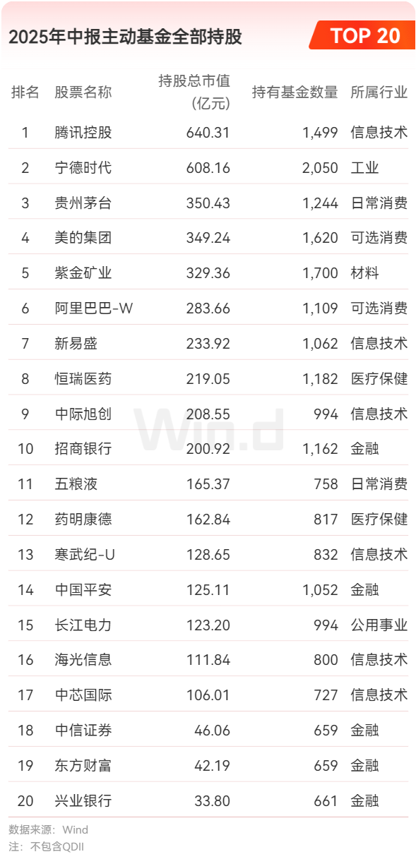 2025年中报,主动基金全部持股中前三大重仓股的所属行业分别为信息技术、工业和日常消费。其中,腾讯控股(00700)的持股总市值位列第一,达640.31亿元,被1499只主动基金共同持有。