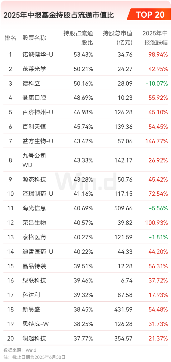 按持股占流通市值比统计,2025年中报公募基金持股占比高的股票在2025上半年获得显著的涨幅。